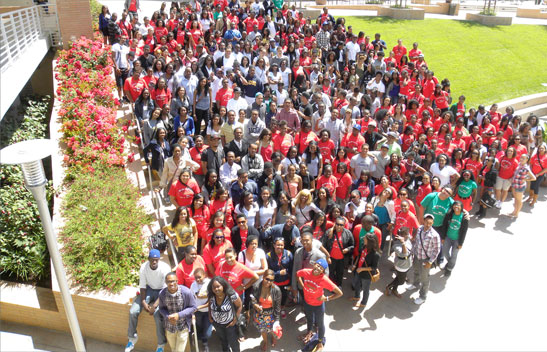Crowd of UCR ASP community gathered on campus lawn.